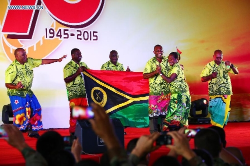 Vanuatuan officers and soldiers, who will participate in China's military parade on Sept. 3, sing a song in a party at military parade training base in Beijing, capital of China, Aug. 25, 2015. Nearly 1,000 foreign troops from 17 countries will participate in China's military parade marking the 70th anniversary of the end of World War II on Sept. 3. (Xinhua/Zha Chunming)