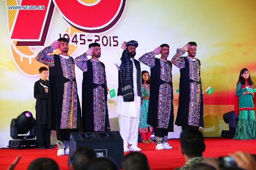 Pakistani officers and soldiers, who will participate in China's military parade on Sept. 3, perform in a party at military parade training base in Beijing, capital of China, Aug. 25, 2015. Nearly 1,000 foreign troops from 17 countries will participate in China's military parade marking the 70th anniversary of the end of World War II on Sept. 3. (Xinhua/Zha Chunming)