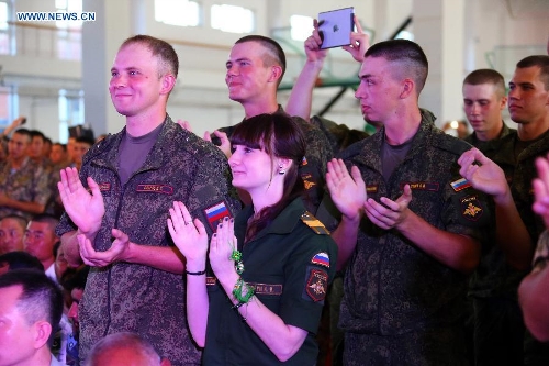 Foreign officers and soldiers, who will participate in China's military parade on Sept. 3, cheer as they watch a performance in a party at military parade training base in Beijing, China, Aug. 25, 2015. Nearly 1,000 foreign troops from 17 countries will participate in China's military parade marking the 70th anniversary of the end of World War II on Sept. 3. (Xinhua/Zha Chunming)