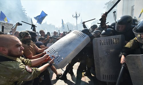 Activists from several radical Ukrainian parties clash with police officers in front of the parliament in Kiev on Monday. One police officer was killed and more than 100 people were injured after a grenade exploded outside parliament as lawmakers gave initial approval to constitutional changes granting more autonomy to rebels in eastern Ukraine. Photo: AFP