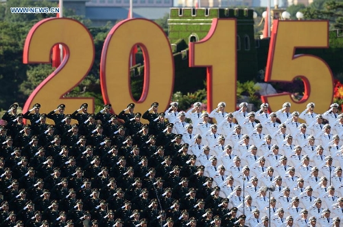 Members of a joint military band prepare for the commemoration activities to mark the 70th anniversary of the victory of the Chinese People's War of Resistance Against Japanese Aggression and the World Anti-Fascist War, in Beijing, capital of China, Sept. 3, 2015. (Xinhua/Liu Xiao)