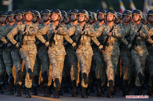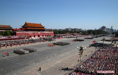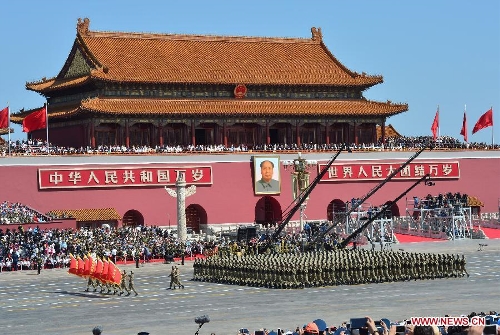 Foot formations march through the Tian'anmen Square during a parade in Beijing, capital of China, Sept. 3, 2015. China on Thursday held commemoration activities, including a grand military parade, to mark the 70th anniversary of the victory of the Chinese People's War of Resistance Against Japanese Aggression and the World Anti-Fascist War. (Xinhua/Yin Gang)