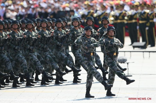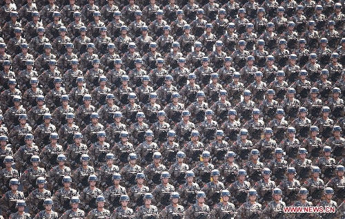 Soldiers of a foot formation march during a parade in Beijing, capital of China, Sept. 3, 2015. China on Thursday held commemoration activities, including a grand military parade, to mark the 70th anniversary of the victory of the Chinese People's War of Resistance Against Japanese Aggression and the World Anti-Fascist War. (Xinhua/Yao Dawei)