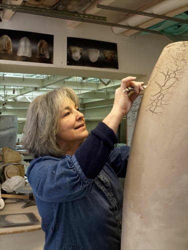 She started out with clay, and then introduced other materials such as wood and leather. Some of her works are burned with sawdust after they are removed from the kiln.