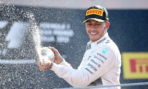 Mercedes' British driver Lewis Hamilton celebrates his Italian Grand Prix victory in Monza on Sunday. Photo: CFP