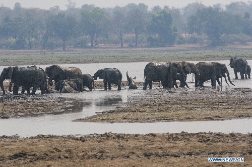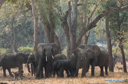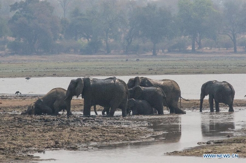 Elephants walk by a river in the Gonarezhou National Park, southeast Zimbabwe, on Sept. 2, 2015. Situated in southeastern Zimbabwe, the 5,000 sq km Gonarezhou National Park is the second largest national park in the country, and forms part of one of the world's largest conservation areas-the Greater Limpopo Transfrontier Park, with the Kruger National Park of South Africa to the south and the Limpopo National Park of Mozambique to the southeast. Gonarezhou, which is translated as "the place of elephants" in local Shona language, also has one of the world's highest elephant population densities-2 elephants per sq kilometers-with an estimated total elephant population of 11,000. (Xinhua/Xu Lingui)
