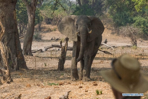 An elephant walks towards tourists in the Gonarezhou National Park, southeast Zimbabwe, on Sept. 2, 2015. Situated in southeastern Zimbabwe, the 5,000 sq km Gonarezhou National Park is the second largest national park in the country, and forms part of one of the world's largest conservation areas-the Greater Limpopo Transfrontier Park, with the Kruger National Park of South Africa to the south and the Limpopo National Park of Mozambique to the southeast. Gonarezhou, which is translated as "the place of elephants" in local Shona language, also has one of the world's highest elephant population densities-2 elephants per sq kilometers-with an estimated total elephant population of 11,000. (Xinhua/Xu Lingui)