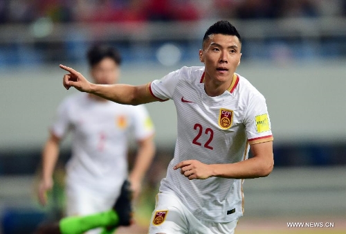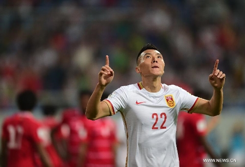 China's Yu Dabao celebrates scoring during the 2018 FIFA World Cup qualifying match against the Maldives at Shenyang Olympic Center stadium in Shenyang, capital of northeast China's Liaoning Province, Sept. 8, 2015. China won the match 3-0. (Xinhua/Yang Qing)