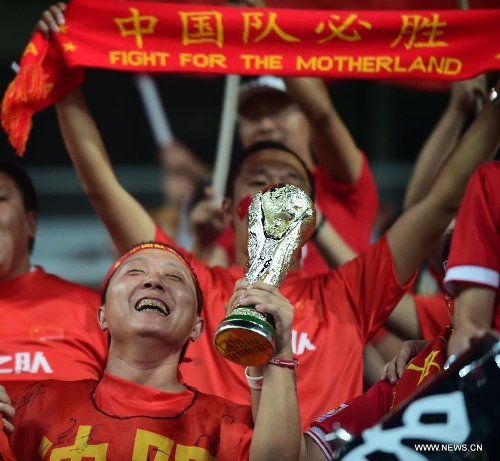 China's fans cheer for the team during the 2018 FIFA World Cup qualifying match between China and the Maldives at Shenyang Olympic Center stadium in Shenyang, capital of northeast China's Liaoning Province, Sept. 8, 2015. China won the match 3-0. (Xinhua/Yang Qing)