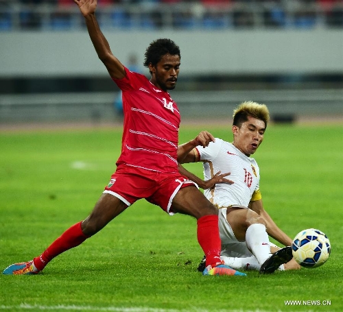China's Zheng Zhi (R) vies for the ball during the 2018 FIFA World Cup qualifying match against the Maldives at Shenyang Olympic Center stadium in Shenyang, capital of northeast China's Liaoning Province, Sept. 8, 2015. China won the match 3-0. (Xinhua/Yang Qing)
