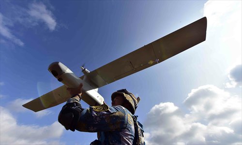 A soldier tests a drone during a drill held in Chengdu, Southwest China's Sichuan Province. Photo: CFP