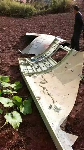 A man stands next to a piece of debris from the Long March-6 rocket found in farmland in Pinghe village, Chongqing, on Sunday after the rocket, carrying 20 mini-satellites, took off from a satellite center in Shanxi Province. Photo: IC