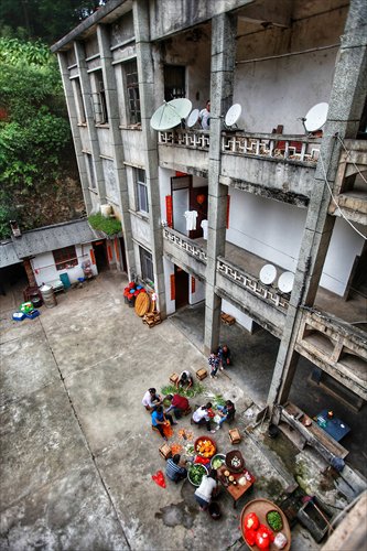 Villagers congregate in front of the old school building to help the couple with their wedding. Photo: CFP