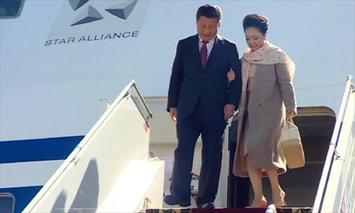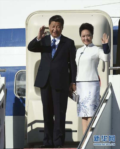 Chinese President Xi Jinping and his wife Peng Liyuan wave upon their arrival in Seattle, US, on September 22, 2015. Xi arrived in the Pacific coast city to start his official state visit to the US. Photo: Xinhua