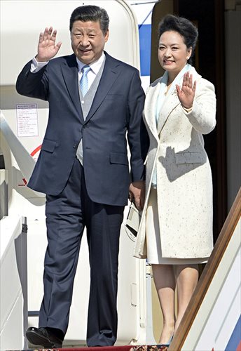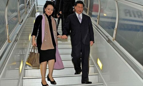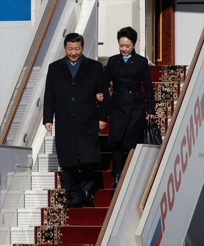 Xi and Peng arrive at Vnukovo International Airport outside Moscow, Russia, for visit on March 22, 2013. Photo: Xinhua