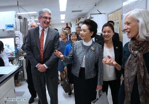 Peng Liyuan (R, front), wife of Chinese President Xi Jinping, visits the Fred Hutchinson Cancer Research Center in Seattle, the United States, Sept. 23, 2015. Photo: Xinhua