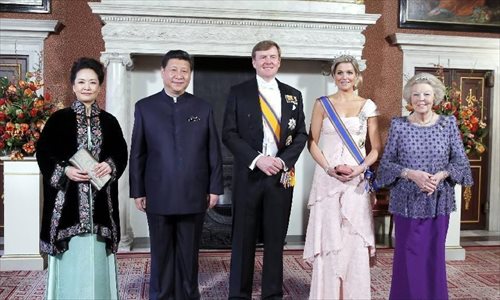 Chinese President Xi Jinping (2nd L), his wife Peng Liyuan (L), Dutch King Willem-Alexander (C), Queen Maxima (2nd R) and former Queen Beatrix (R) pose for photos in Amsterdam, the Netherlands, March 22, 2014.Photo: Xinhua