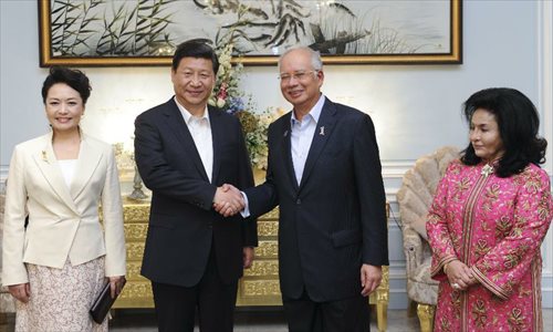 Chinese President Xi Jinping (2nd L) and his wife Peng Liyuan (1st L) attend a banquet hosted by Malaysian Prime Minister Najib Razak (2nd R) and his wife Rosmah Mansor (1st R) at their residence in Kuala Lumpur, capital of Malaysia, October 3, 2013. Photo: Xinhua