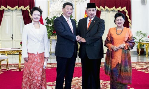 Chinese President Xi Jinping (2nd, L) meets with his Indonesian counterpart Susilo Bambang Yudhoyono(2nd, R), in Jakarta, capital of Indonesia, October 2, 2013. Photo: Xinhua