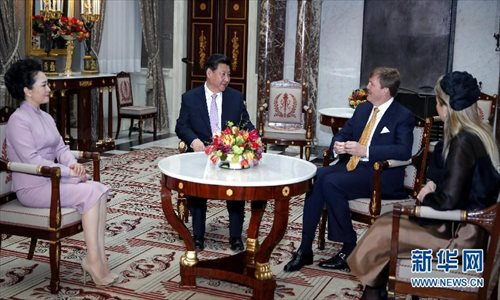 Chinese President Xi Jinping (2nd L) meets with Dutch King Willem-Alexander (2nd R) in Amsterdam, the Netherlands, March 22, 2014. Photo: Xinhua