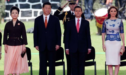 Chinese President Xi Jinping (2nd L) attends a welcoming ceremony held for him by Mexican President Enrique Pena Nieto (2nd R) in Mexico City, capital of Mexico, June 4, 2013. Photo: Xinhua