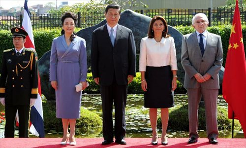 Chinese President Xi Jinping (2nd L, front) and his wife Peng Liyuan (1st L, front) pose for a photo together with Costa Rican President Laura Chinchilla (2nd R, front) and her husband Jose Maria Rico (1st R, front) during a welcoming ceremony at the presidential house in San Jose, Costa Rica, June 3, 2013. Photo: Xinhua