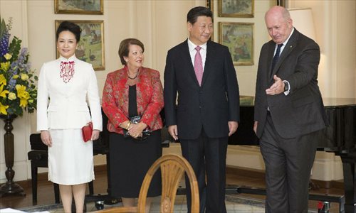 Chinese President Xi Jinping (2nd R) and his wife Peng Liyuan (L) are welcomed by Australian Governor-General Peter Cosgrove (R) and his wife Lynne Cosgrove (2nd L) in Canberra, capital of Australia, November 17, 2014. Photo: Xinhua