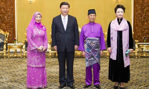 Chinese President Xi Jinping (2nd L) meets with Malaysian Supreme Head of State Abdul Halim (2nd R) in Kuala Lumpur, capital of Malaysia, October 4, 2013.Photo: Xinhua