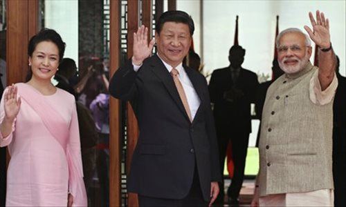 Indian Prime Minister Narendra Modi (right), Chinese President Xi Jinping and Xi's wife Peng Liyuan wave to the media after Modi received them upon arrival at a hotel in Ahmedabad, India, on September 17, 2014 for a three-day visit. Photo: AP