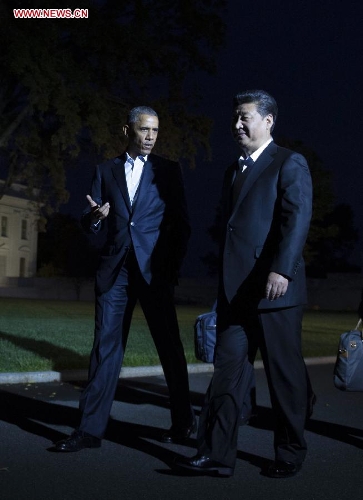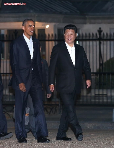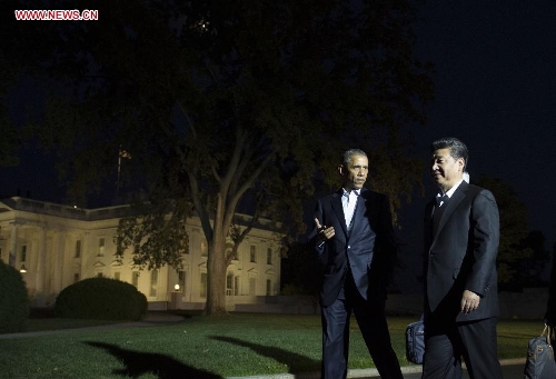 Chinese President (R) and his US counterpart walk to a private dinner near the in Washington D.C., capital of the , Sept. 24, 2015. Photo: Xinhua