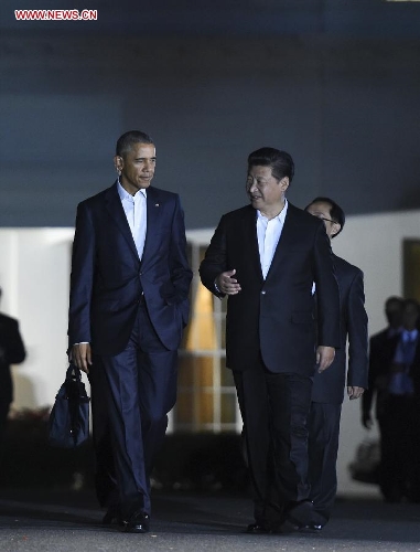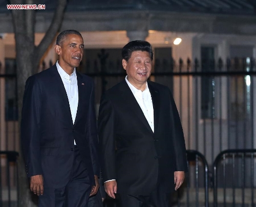 Chinese President Xi Jinping (R) and his US counterpart Barack Obama walk to a private dinner near the White House in Washington D.C., capital of the United States, Sept. 24, 2015. Photo: Xinhua