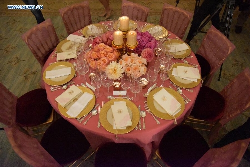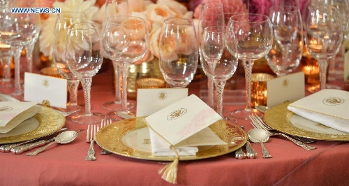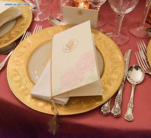 Photo taken on Sept. 24, 2015 shows the dinnerware and flowers for the state dinner at the White House in Washington, D.C., the United States. White House chefs have created "original dishes that highlight American cuisine with nuances of Chinese flavors" for the state dinner honoring visiting Chinese President Xi Jinping, the White House said Thursday. (Xinhua/Bao Dandan)