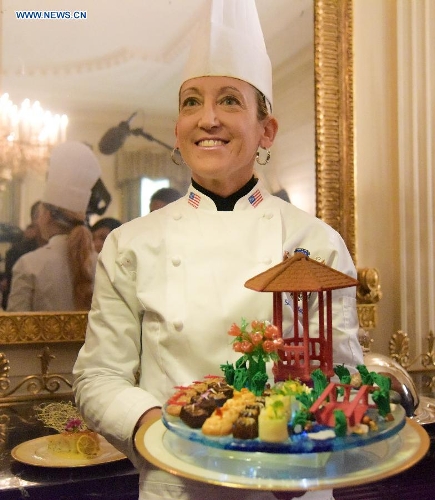 The pastry chef displays a dessert that features a Chinese-style chocolate pavilion and bridge at the White House in Washington, D.C., the United States, on Sept. 24, 2015. White House chefs have created "original dishes that highlight American cuisine with nuances of Chinese flavors" for the state dinner honoring visiting Chinese President Xi Jinping, the White House said Thursday. (Xinhua/Bao Dandan)