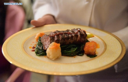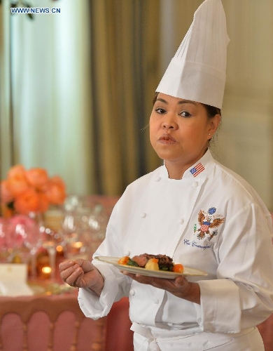 The chef displays a main course of the state dinner, butter poached Maine lobster and grilled Colorado lamb, at the White House in Washington, D.C., the United States, Sept. 24, 2015. White House chefs have created "original dishes that highlight American cuisine with nuances of Chinese flavors" for the state dinner honoring visiting Chinese President Xi Jinping, the White House said Thursday. (Xinhua/Bao Dandan)