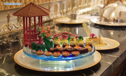 Photo taken on Sept. 24, 2015 shows a dessert that features a Chinese-style chocolate pavilion and bridge at the White House in Washington, D.C., the United States. White House chefs have created "original dishes that highlight American cuisine with nuances of Chinese flavors" for the state dinner honoring visiting Chinese President Xi Jinping, the White House said Thursday. (Xinhua/Bao Dandan)