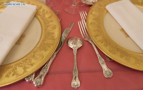 Photo taken on Sept. 24, 2015 shows the dinnerware for the state dinner at the White House in Washington, D.C., the United States. White House chefs have created "original dishes that highlight American cuisine with nuances of Chinese flavors" for the state dinner honoring visiting Chinese President Xi Jinping, the White House said Thursday. (Xinhua/Bao Dandan)