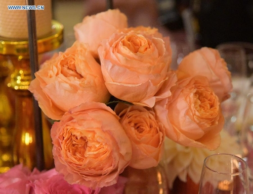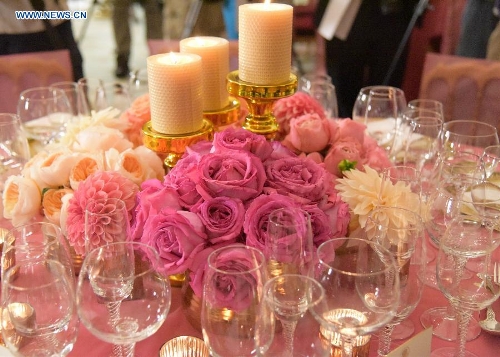 Photo taken on Sept. 24, 2015 shows the flowers for the state dinner at the White House in Washington, D.C., the United States. White House chefs have created "original dishes that highlight American cuisine with nuances of Chinese flavors" for the state dinner honoring visiting Chinese President Xi Jinping, the White House said Thursday. (Xinhua/Bao Dandan)