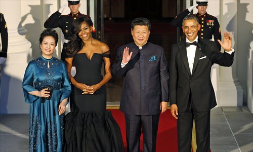 Chinese President Xi Jinping and US President Barack Obama wave accompanied by their wives Peng Liyuan and Michelle Obama as they arrive for a state dinner at the White House in Washington, DC on Friday. Photo: AP
