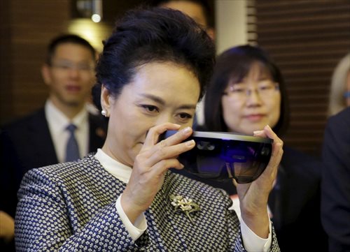 Peng Liyuan, wife of President Xi, examines Microsoft's HoloLens device during a tour of Microsoft's main campus in Redmond, Washington on Wednesday. Photo: CFP