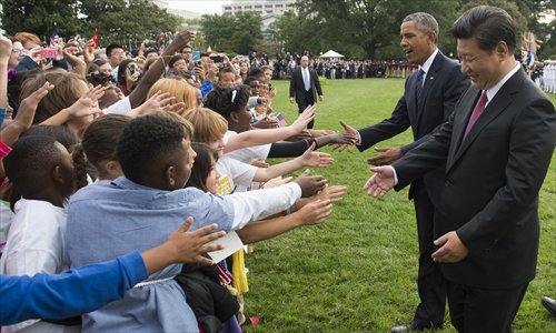 Chinese President Xi Jinping and US President Barack Obama greet school children during a State Arrival ceremony on the South Lawn of the White House in Washington DC on Friday. President Xi is on his first state visit to the US from Tuesday, visiting Seattle, Washington and New York. Photo: AFP