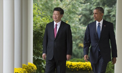 President Xi and President Obama arrive for a joint press conference in the Rose Garden at the White House in Washington on Friday. Photo: AFP