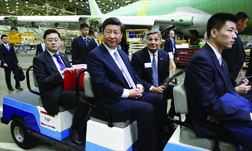 President Xi Jinping and Ray Conner, president and CEO of Boeing Commercial Airplanes, tour the Boeing assembly line in Everett, Washington, on Wednesday. Boeing has reached deals with Chinese firms to sell 300 aircraft and set up a completion center in China. Photo: AFP
