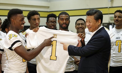 President Xi smiles and points at his name on the back of a football jersey presented to him by senior player Mushawn Knowles during a visit to Lincoln High School in Tacoma, Washington State on Wednesday. Photo: AP