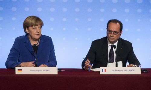 French President Francois Hollande (R) attends a joint press conference together with German Chancellor Angela Merkel in Paris, France, October 2, 2015. Russia warplanes have to strike "only" Islamic States (IS) targets in Syria amid "confusion" over Moscow air forces attacks on rebel groups, French President Francois Hollande and German Chancellor Angela Merkel told Russian leader Vladimir Putin at a Paris meeting on Friday. Photo:Xinhua