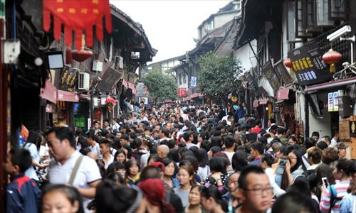 Photo taken on Oct. 5, 2015 shows Ciqikou ancient town crowded with tourists, in southwest China's Chongqing Municipality. Ciqikou ancient town received 49,000 person-time on Sunday, according to the authority.Photo: Xinhua