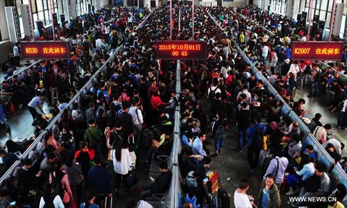 Passengers queue to board trains at the railway station of Zhengzhou, capital of central China's Henan Province, Oct. 1, 2015. A travel peak is seen in Zhengzhou on Thursday, the first day of the National Day holidays which spans from Oct. 1 to 7. Photo: Xinhua