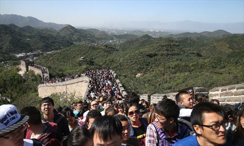Tourists cram onto the Great Wall in Beijing, capital of China, Oct. 2, 2015, the second day of the National Day holidays. Photo: Xinhua