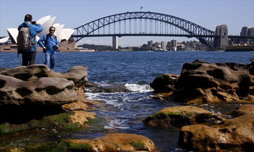 Chinese tourists take pictures of themselves standing in front of the Sydney Opera House in Sydney, Australia on September 28. Photo: CFP