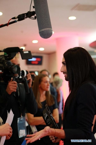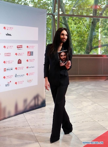Conchita Wurst talks with the media at the red carpet before the opening ceremony of the 2015 Frankfurt Book Fair in Frankfurt, Germany on Oct. 13, 2015. (Xinhua/Luo Huanhuan)
