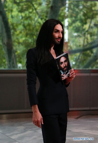 Conchita Wurst poses with his book at the red carpet before the opening ceremony of the 2015 Frankfurt Book Fair in Frankfurt, Germany on Oct. 13, 2015. (Xinhua/Luo Huanhuan)